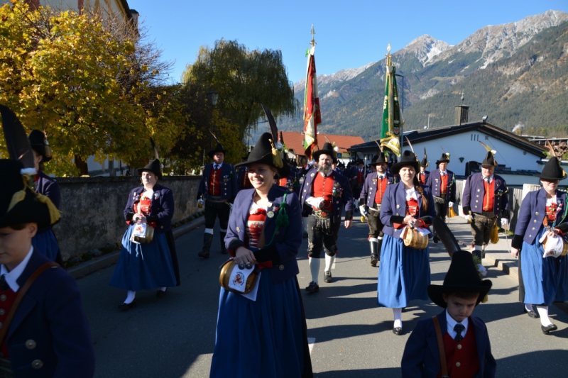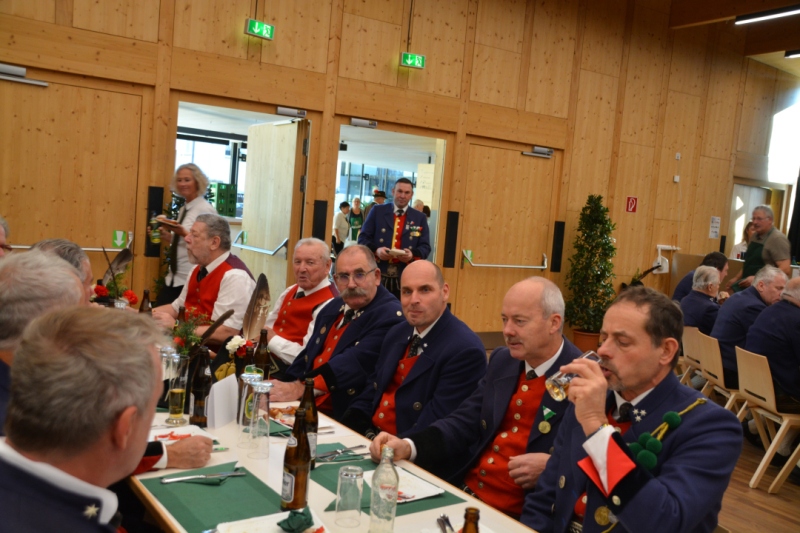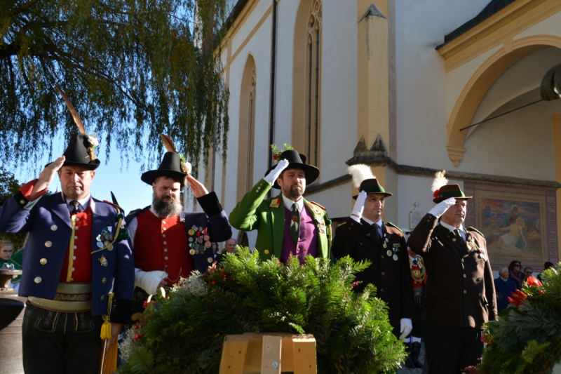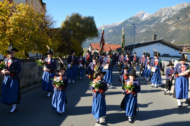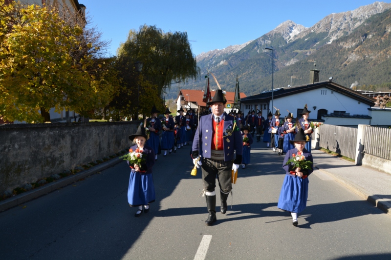 Der 98.Jahrtag der Absamer Schützen zeigt von einer guten Entwicklung der Kompanie. So konnte Hauptmann Major Kurt Mayr, sichtlich stolz, insgesamt 87 Marketenderinnen, Schützen, Jungmarketenderinnen und Jungschützen dem Landeskommandant Major Thomas Saurer und Bürgermeister Manfred Schafferer melden. Er meldete auch die mitfeiernde Schützengilde und die Abordnungen der befreundeten Kompanien aus Südtirol und Mittenwald. Anschließend marschierten alle Schützen und die Ehrengäste, angeführt von der Bürgermusik Absam, zum Festgottesdienst in die Absamer Basilika. Die von der Musikkapelle musikalisch umrahmte Messe zelebrierte Pfarrer Martin Chukwu. Nach dem Gottesdient erfolgte in Erinnerung an die Opfer beider Weltkriege am Kriegerdenkmal die Kranzniederlegung. Dabei erinnerte der Hauptmann an die heutigen großen Wirtschaftsprobleme, sowie den Krieg in der Ukraine. Er rief zur größtmöglichen Toleranz und Hilfestellung gegenüber den Flüchtlingen auf. Die Kompanie schoss für die Gefallenen und verstorbenen Kameraden des vergangenen Jahres eine Ehrensalve und die Musikkapelle intonierte das Lied vom“ Guten Kameraden“.