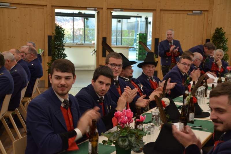 Zum Defilee der Musikkapelle und der Schützen hatten die Ehrengäste am Dorfbrunnen Aufstellung genommen. Am Vorplatz des Gemeindesaales-Kiwi gratulierten die Schützen noch mittels einer Salutsalve den Schützenkameraden, die 2022 einen Geburtstag feierten.